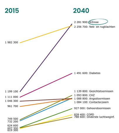 Zo’n 1.5 miljoen Nederlanders hebben artrose, waarvan meer dan 1 miljoen vrouwen, en dit aantal zal blijven stijgen, mede door vergrijzing (zie figuur 2).